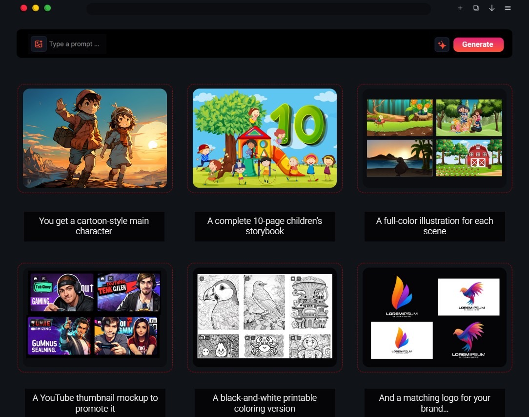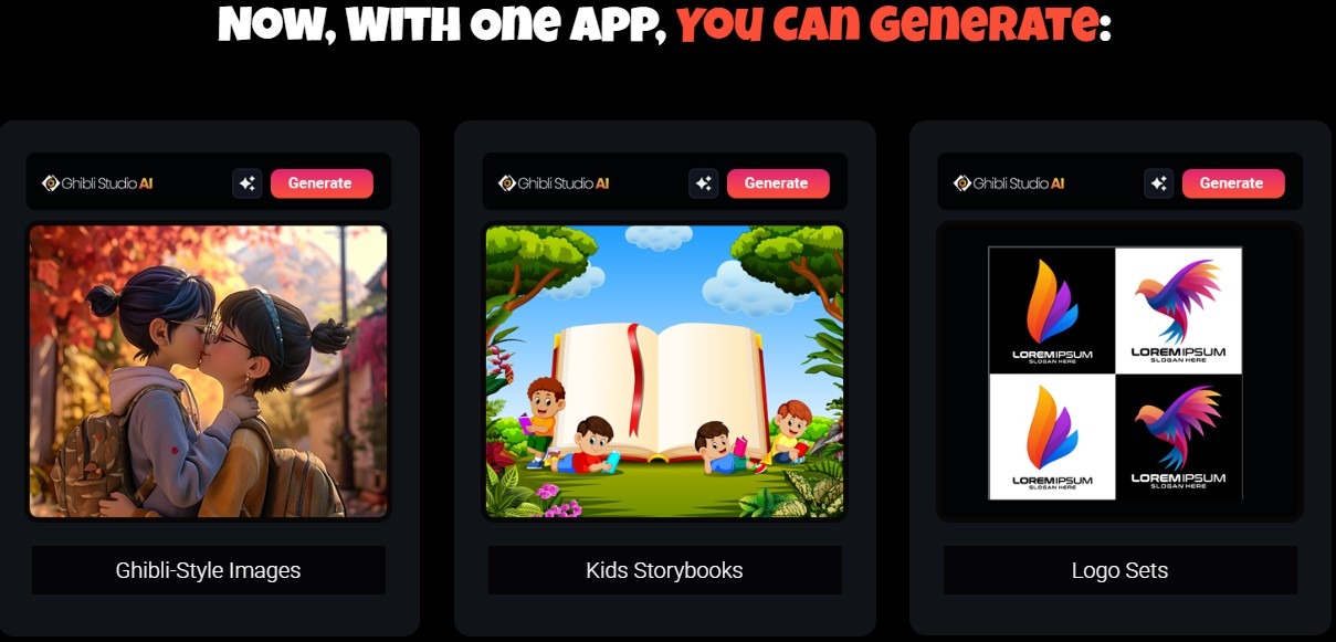 🔹 One Phrase = Many Designs Just type what you need, and Ghibli Studio AI will create images, logos, storybooks, thumbnails, mockups, and more—all in seconds!