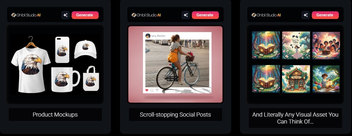 - Ghibli Image Generator – Create stunning HD artwork from just a simple text prompt.