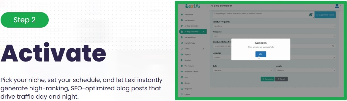 Never blogged before? No worries! Just log in, choose your niche, and Lexi does the rest.